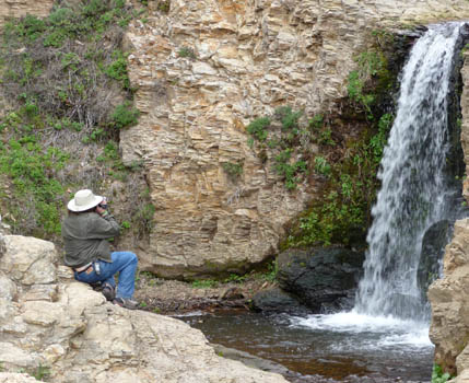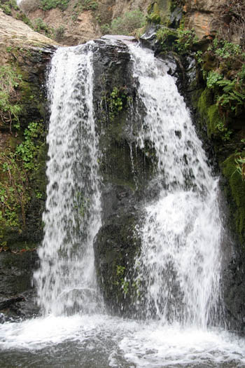 At last we came to the turnoff for Alamere Falls. A sign indicated that the trail was unmaintained and that conditions were hazardous. It was a long, narrow descent with a lot of poison oak right beside the trail. But it brought us to a beautiful falls with many cascades. This was the highest one.