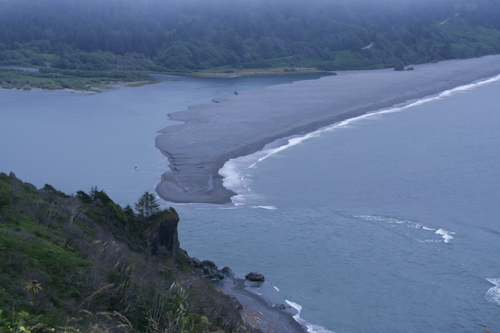 In the federal territory between the state parks, the Klamath River runs into the Pacific Ocean. The pictures on the NPS web site show this in bright sunlight, but the fog was coming in here.