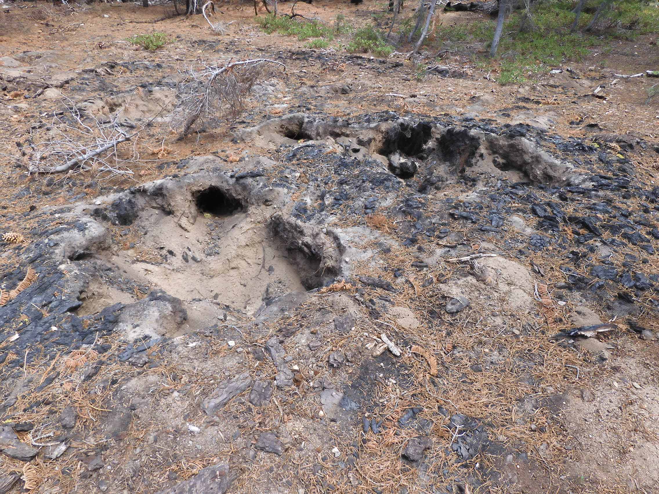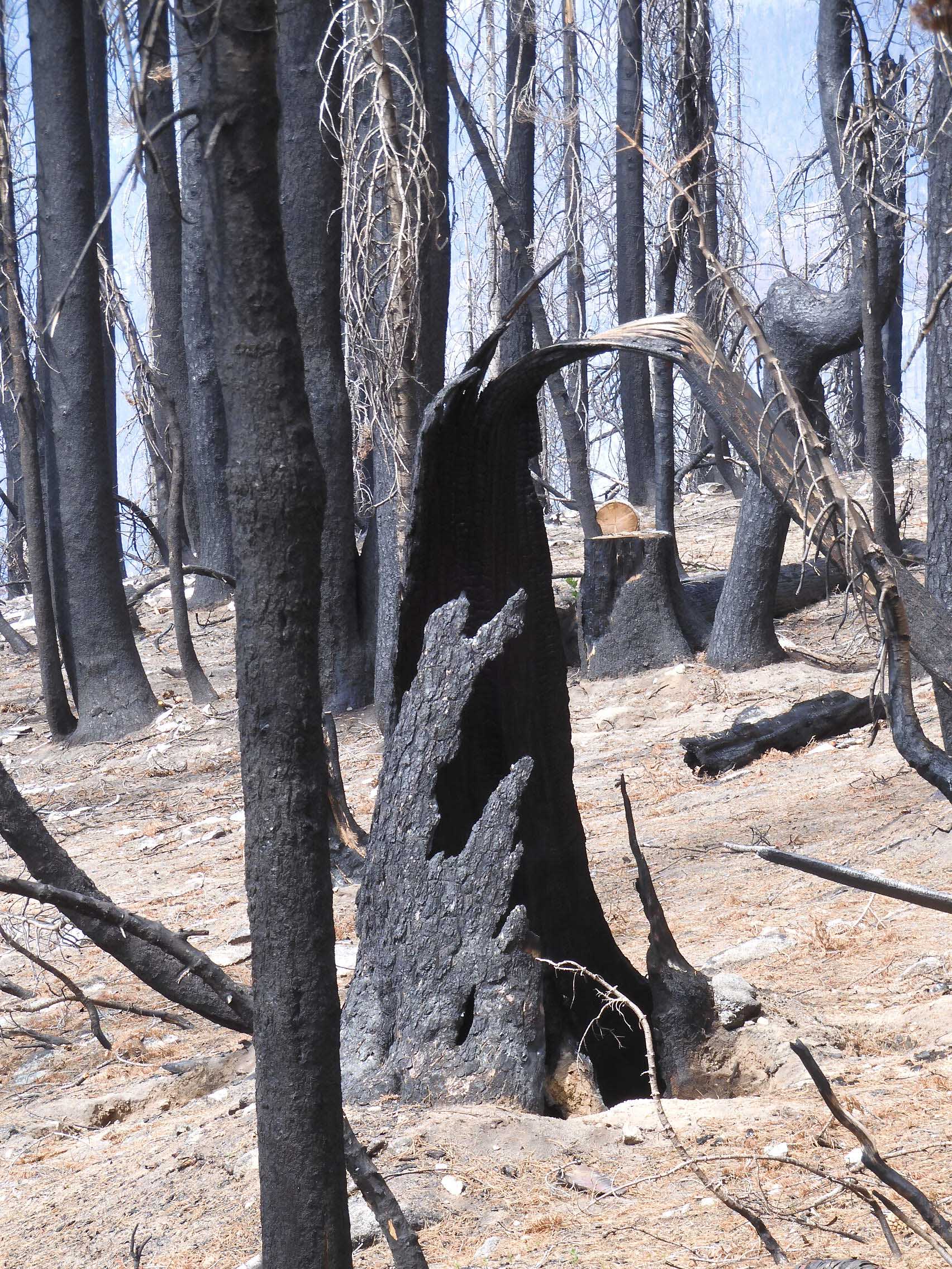We saw many of these sad, empty holes where the fire had entirely consumed large trees that had probably survived for centuries. Photo by Eric.