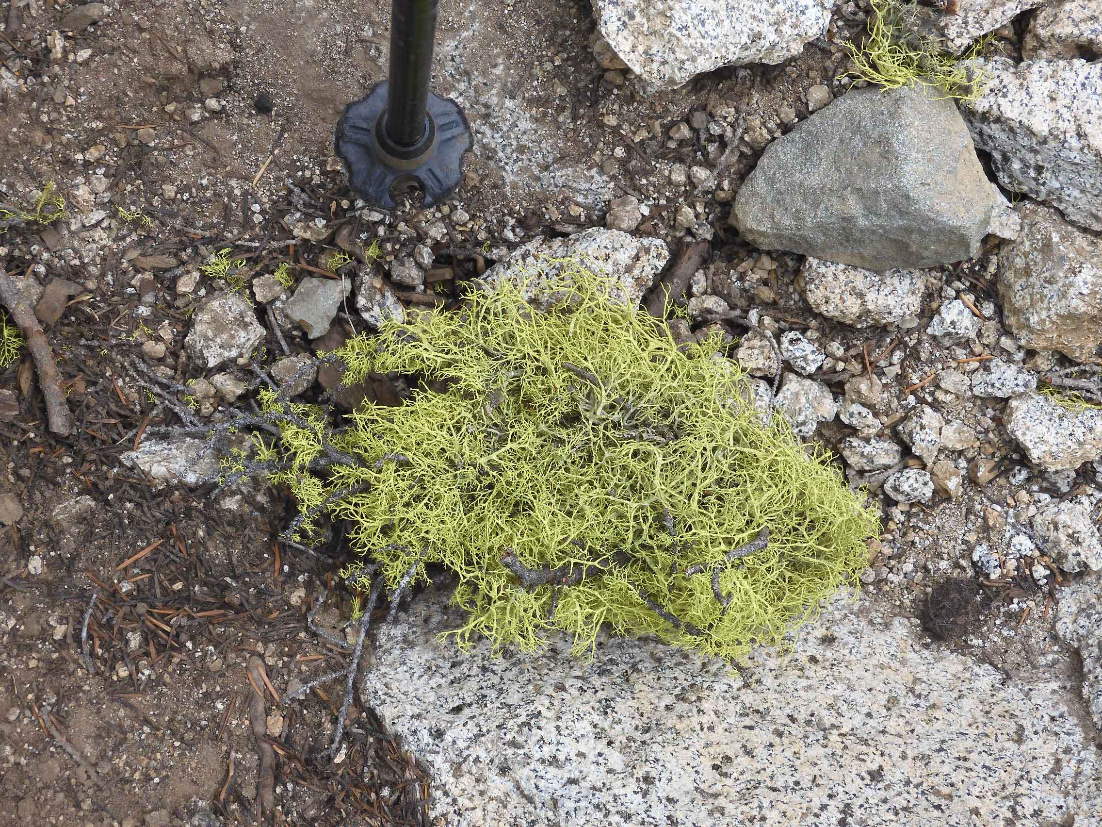 Eric found a large clump of Brown-eyed Wolf Lichen on the path, and included the tip of his pole in the photo for scale.