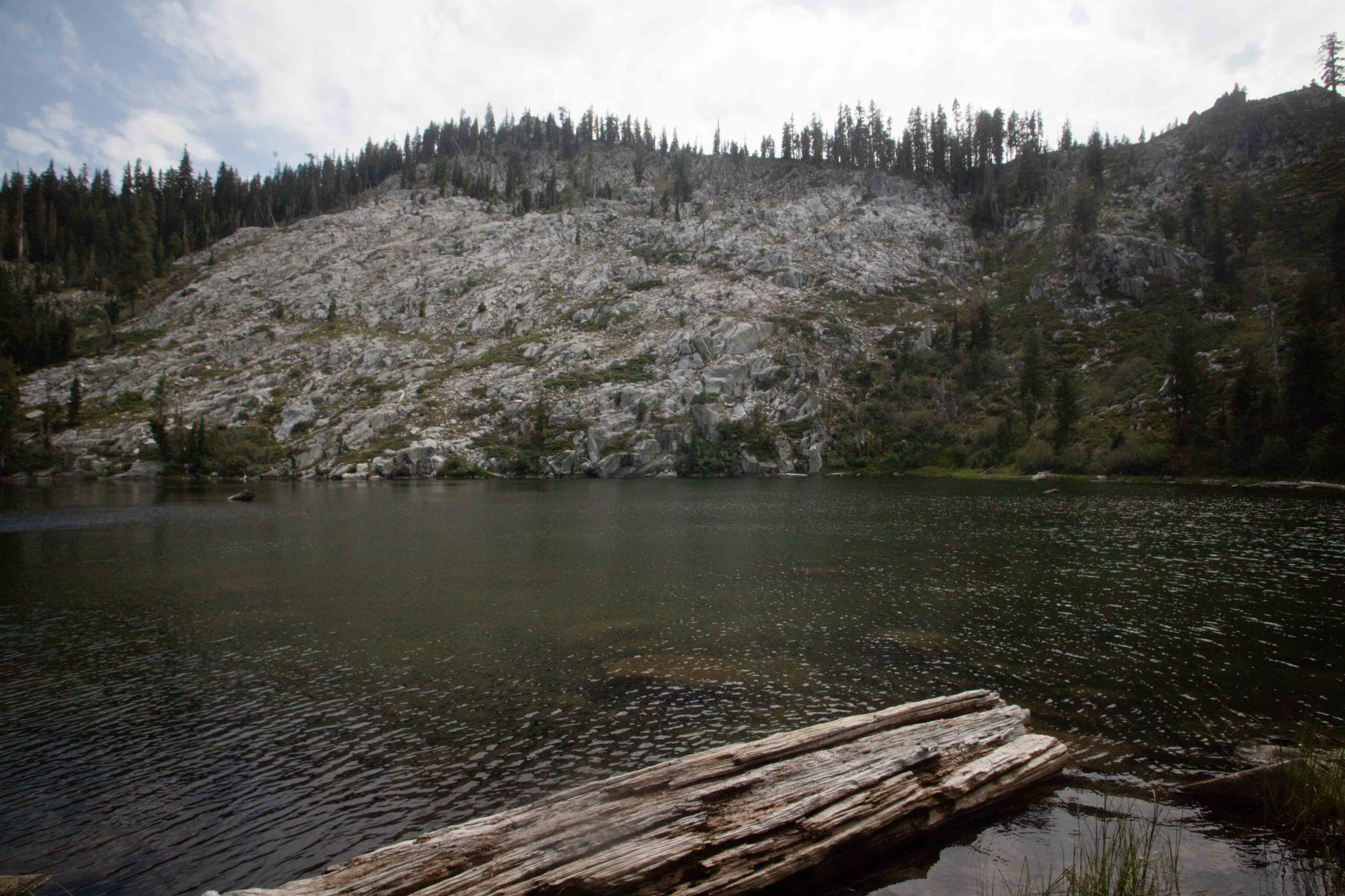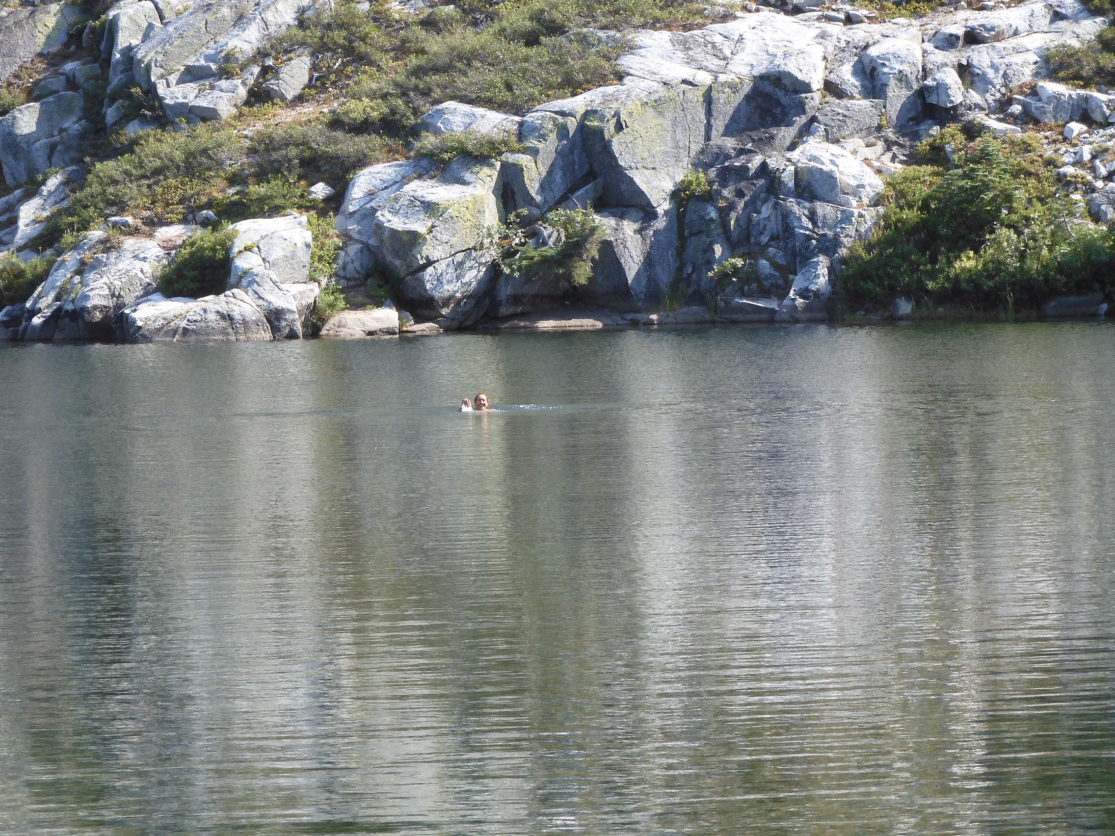 Soares also had promised that Little Boulder Lake would be great for swimming. Especially after the chill of Whiskeytown Falls the day before, I had thought a lake at around 1,950 m/6,400 ft would be exceedingly brisk, tolerable only for a minute or two, even in late July. I was surprised to find that the water felt merely refreshingly cool, even as it deepened. I swam all the way to the other side and back, feeling wonderful.